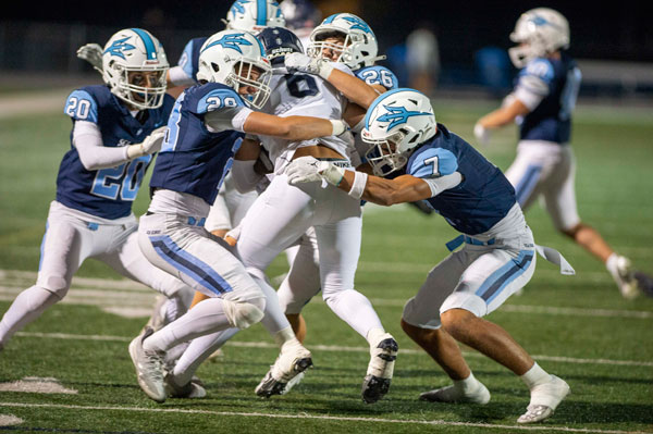 Jake Card (28), Chase Kuchera (26) and Ryan Rakunas (7) swarm to the ball carrier to take him down.