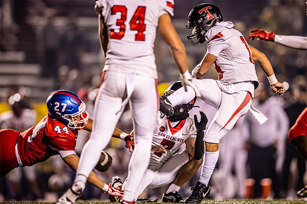 The No. 11 Griffins (5-4, 1-1) took the lead with just 34 seconds left on Lenny Ibarra’s third touchdown, pushing the score to 28-21. But the No. 10 Tritons (4-5, 0-2) weren’t finished, storming downfield on a hook-and-ladder play to bring them within reach of the end zone. San Clemente quarterback Jack Ferguson connected with Jaxson Rex for a touchdown with only 13 seconds left, making it 28-27 and setting up a potential game-tying extra point.