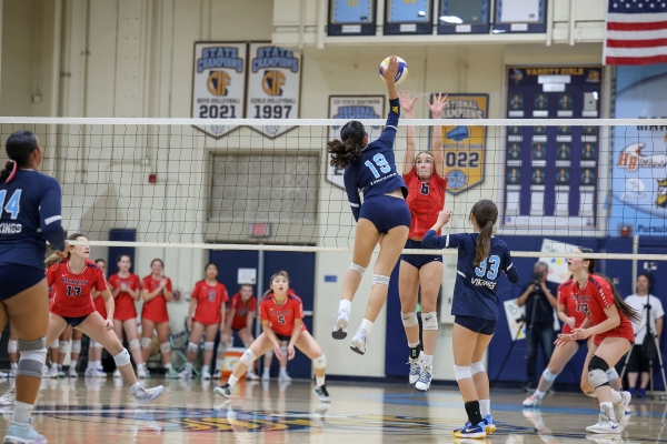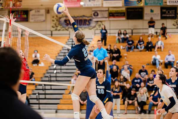 Marina Varsity’s dynamic OH/oppo and Biola University commit, Addison Brown (#22, Junior), unleashes her versatility with a fierce shot at the net for a kill. Photo credit: Brandy Young @byoungforevermedia