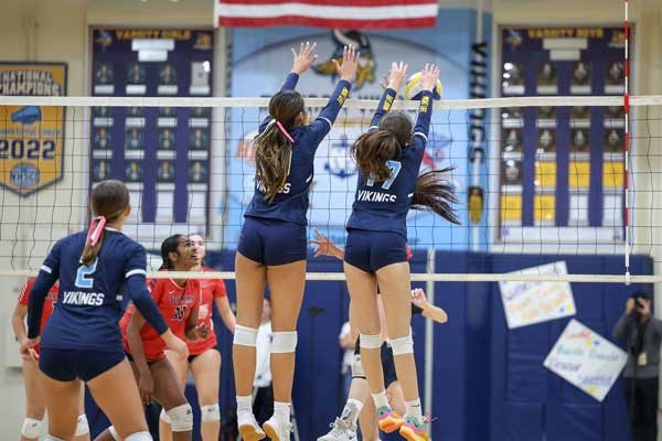 It’s a block party on the court as sophomore MB Jaden Pua (#20) and senior OH/oppo Reese Potter (#17) shut down the opposition with a huge double block. Photo credit: HBUHSD