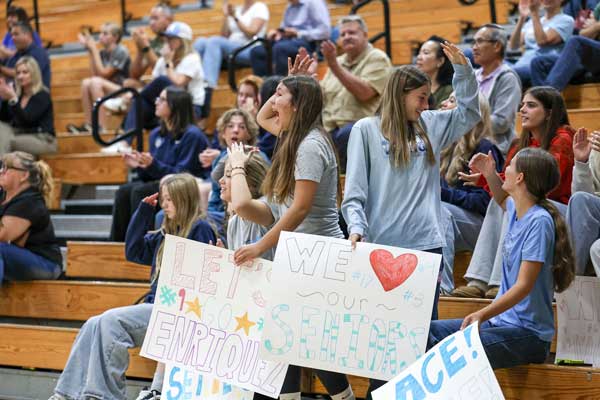 Marina’s student section brings the energy, going head-to-head with Beckman’s crowd in a lively battle of chants. Photo credit: HBUHSD