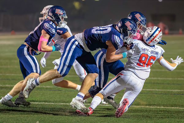 Senior Jaxon Smith (#80) anchoring down on the D-Line for the Newport Harbor Sailors.